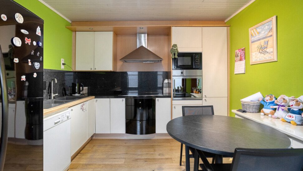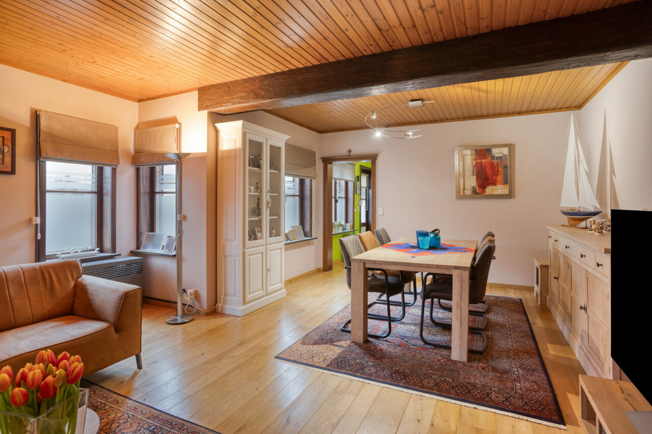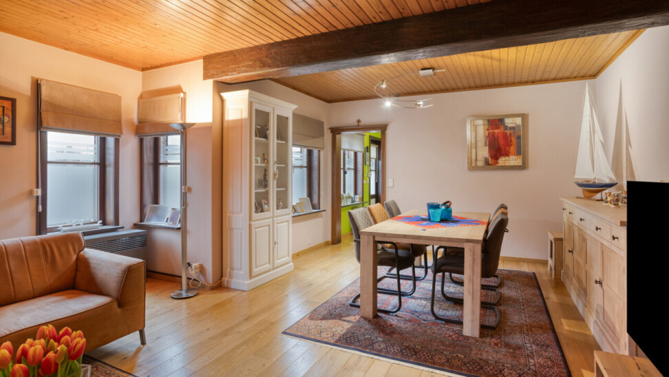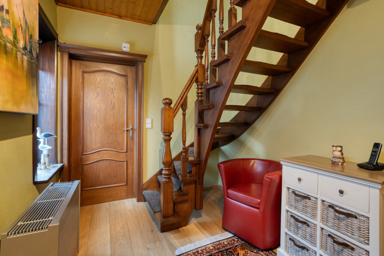 Le rez-de-chaussée offre un espace de vie confortable avec salon et salle à manger, bénéficiant d’une belle luminosité et d’une atmosphère chaleureuse. La cuisine équipée s’y raccorde de manière pratique. Une pièce polyvalente peut être aménagée en bureau ou espace hobby, ainsi qu’un WC invités.