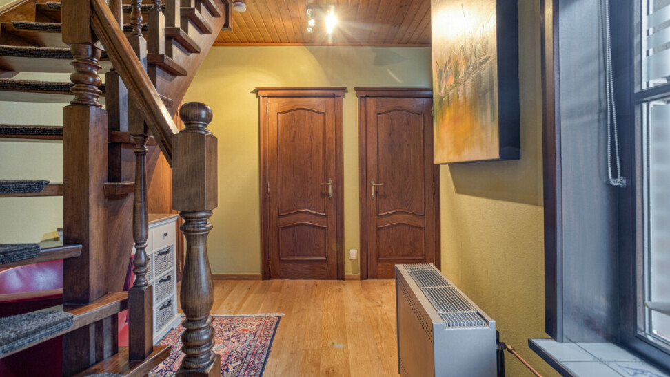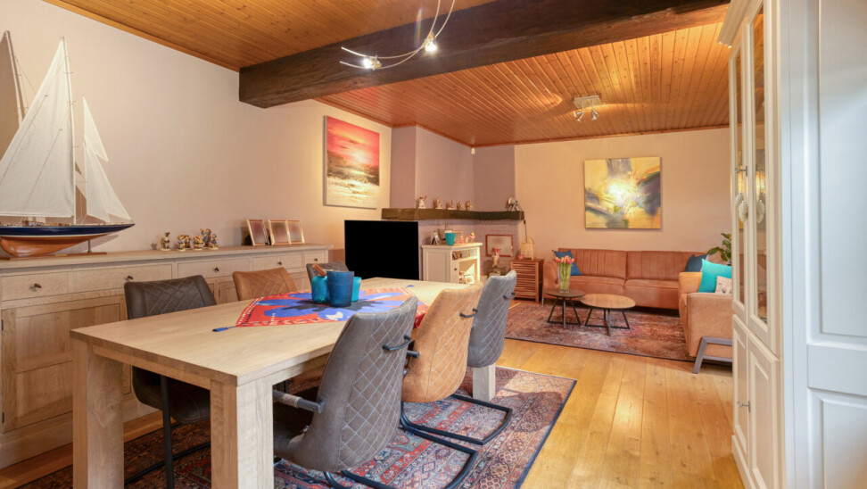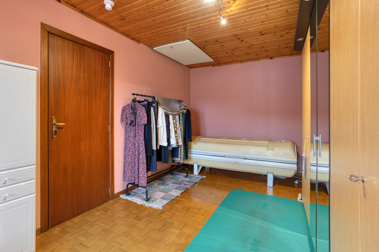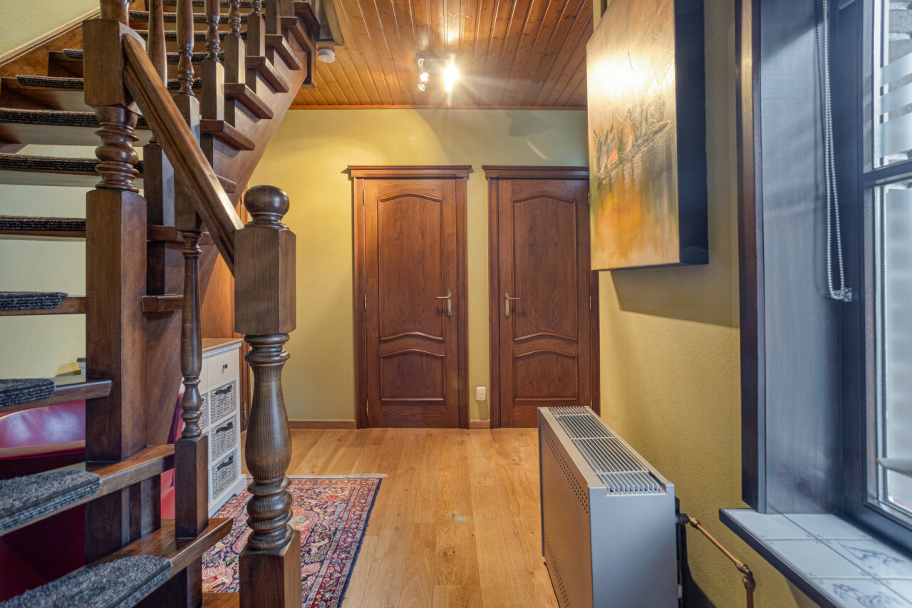 Le rez-de-chaussée offre un espace de vie confortable avec salon et salle à manger, bénéficiant d’une belle luminosité et d’une atmosphère chaleureuse. La cuisine équipée s’y raccorde de manière pratique. Une pièce polyvalente peut être aménagée en bureau ou espace hobby, ainsi qu’un WC invités.
