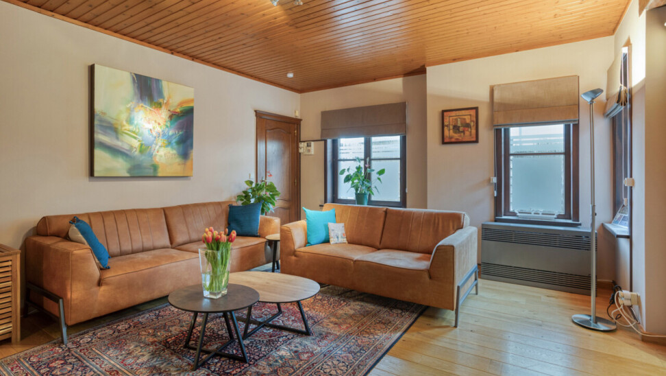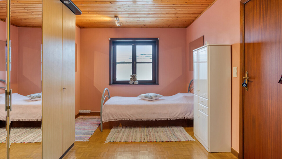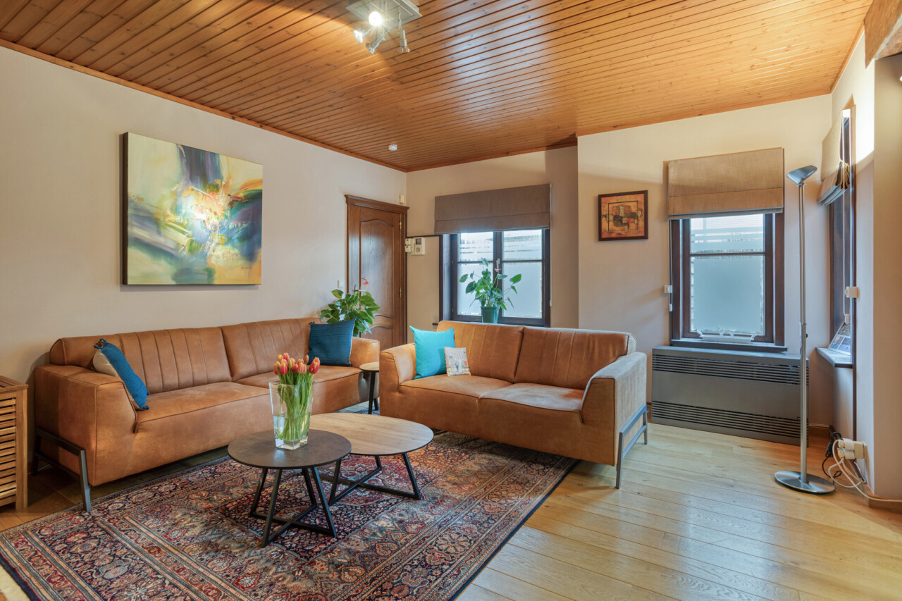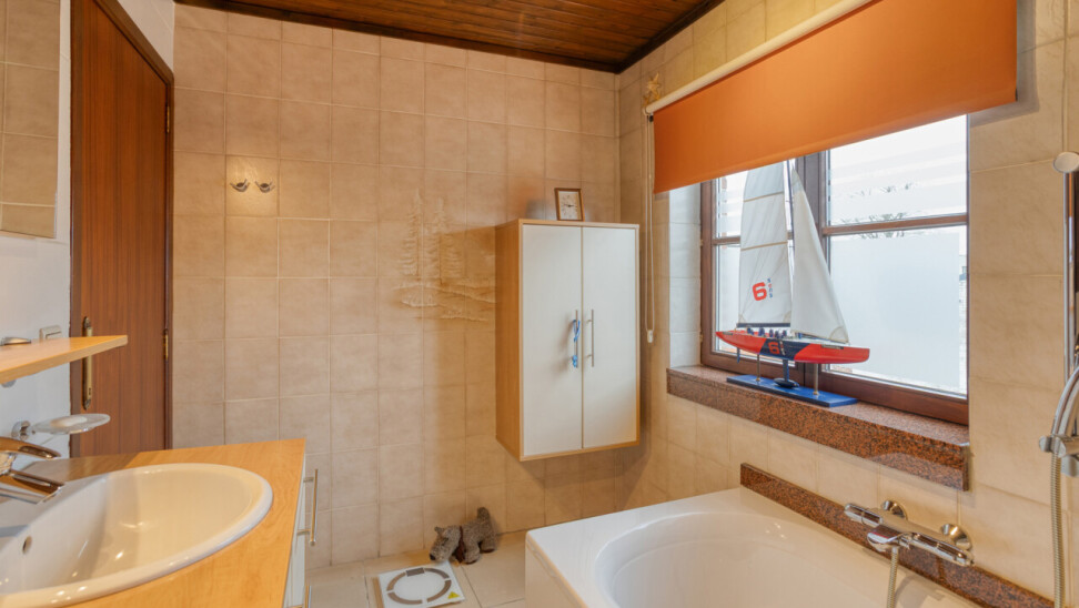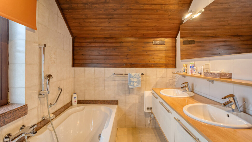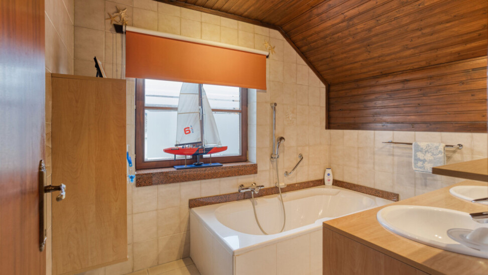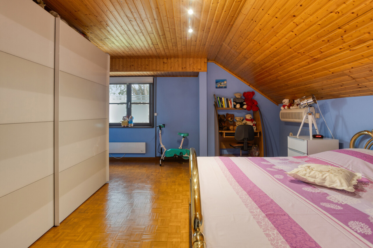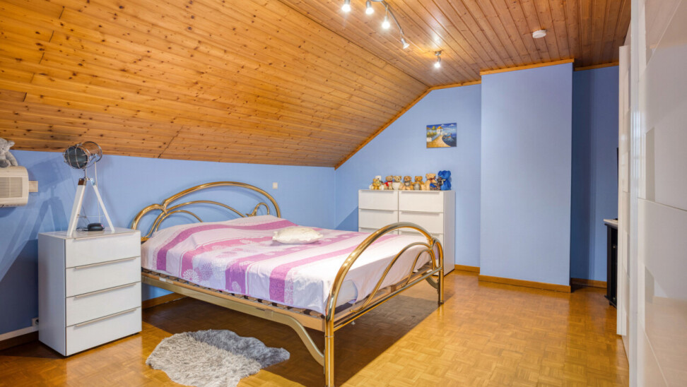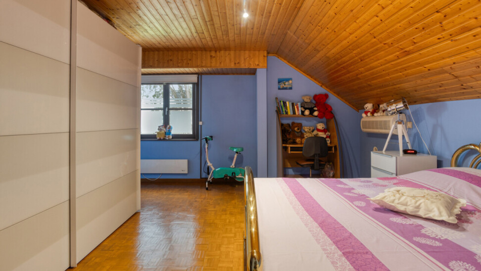 À l’étage se trouvent deux chambres exceptionnellement spacieuses de ± 24 m² et 17 m², un véritable atout par rapport aux maisons semi-mitoyennes classiques. La salle de bains est équipée d’une baignoire et d’un double lavabo, complétée par un WC séparé. Le grenier est accessible et aménageable, offrant un potentiel supplémentaire.