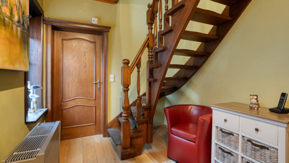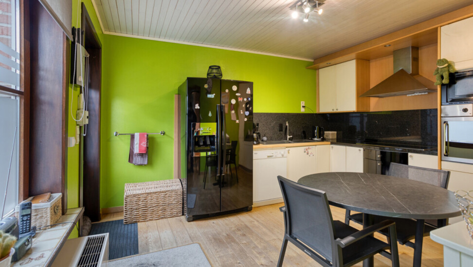 Het gelijkvloers biedt een comfortabele leefruimte met zithoek en eetplaats, met veel lichtinval en een huiselijke sfeer. De ingerichte keuken sluit hier praktisch op aan. Daarnaast is er een polyvalente ruimte, ideaal als bureau of hobbyruimte, en een gastentoilet.